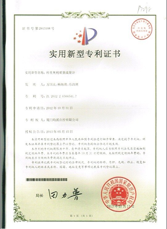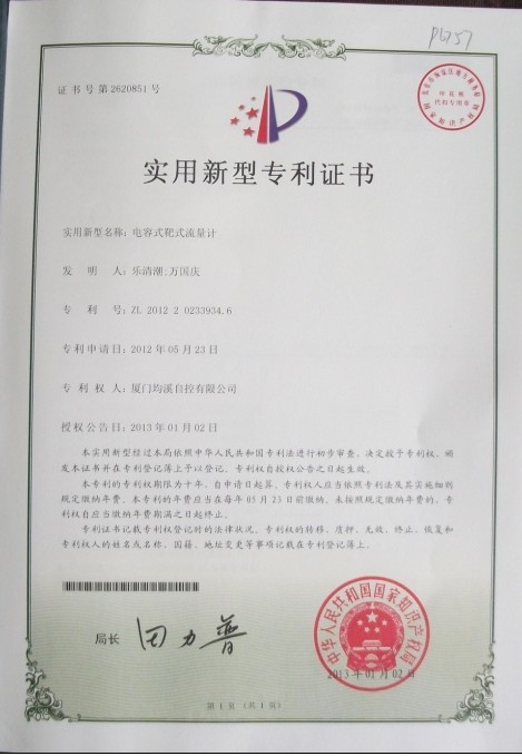 靶式流量計(jì)專利證書(shū)
